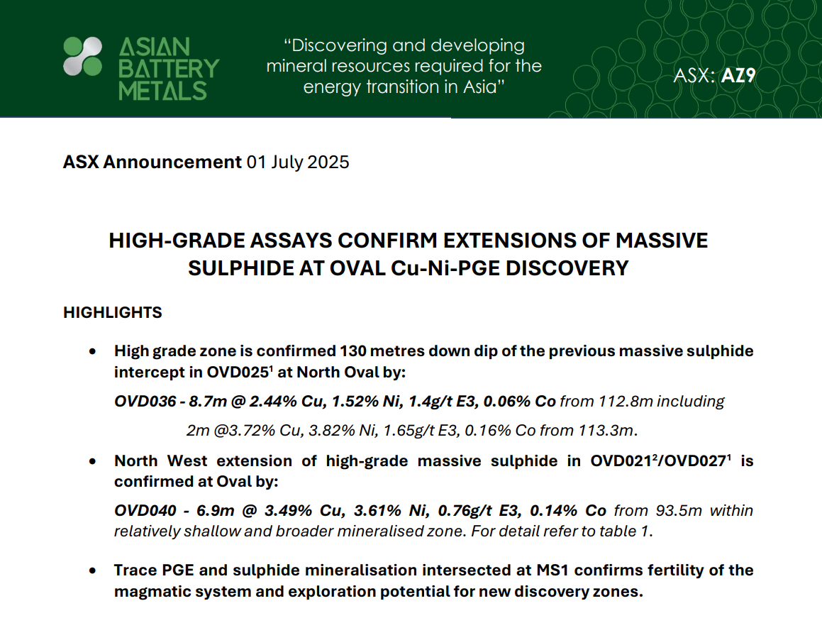 The final assays from Phase 3 drilling at Asian Battery Metals (ASX: AZ9) are in, and they didn't disappoint, with results confirming further shallow high-grade copper and nickel hits at the company’s flagship Oval Project in Mongolia.