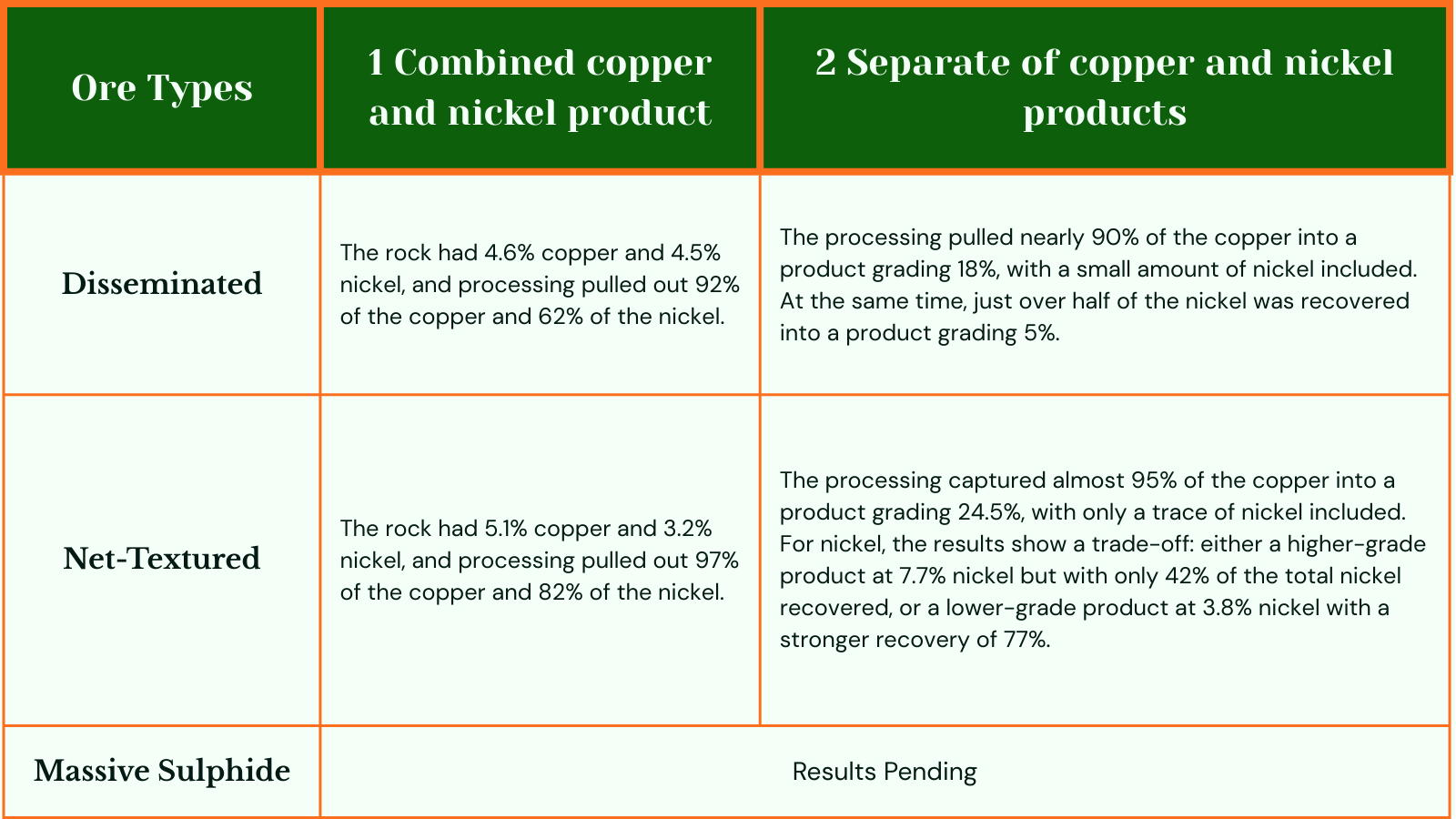 This sample returned a copper concentrate grading 24.5% Cu at 94.9% recovery, with nickel concentrate ranging from 7.7% Ni at 41.6% recovery to 3.8% Ni at 77.2% recovery.