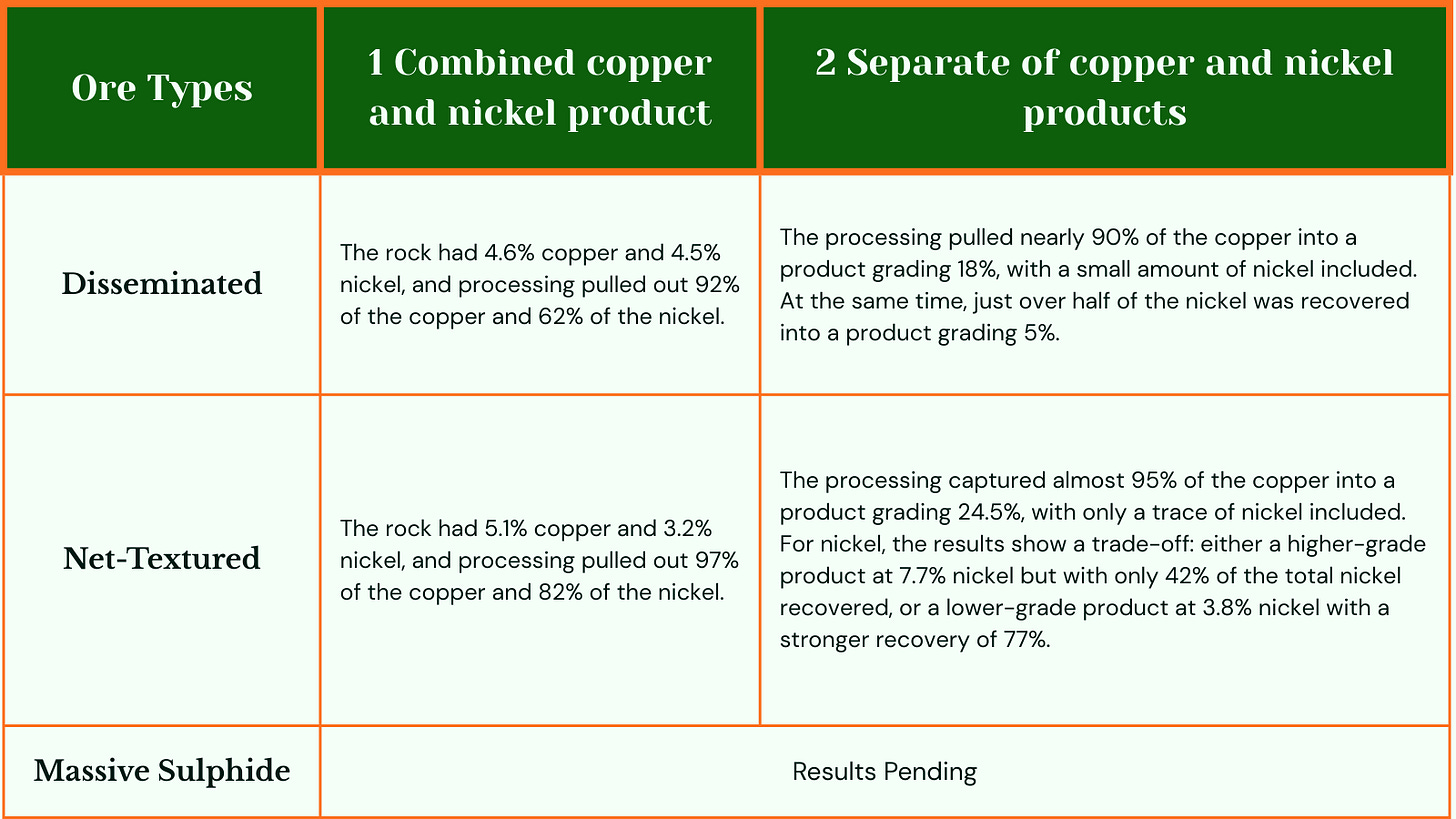 In plain terms, AZ9 pulled nearly 90% of the copper out of lower-grade disseminated rock into a product strong enough to sell, while also recovering about half of the nickel.