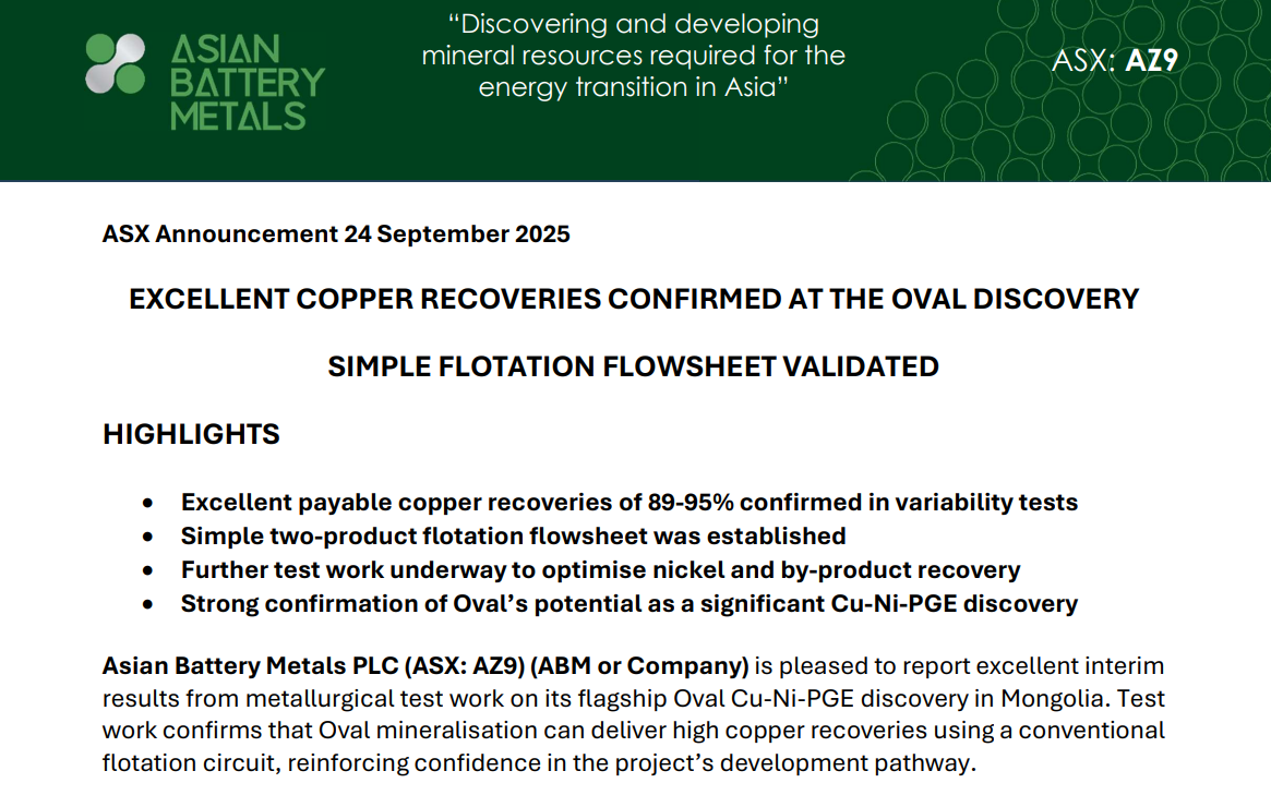 The lab results are in, and they're better than anyone expected. AZ9's Oval discovery just posted copper recoveries that the majors will love