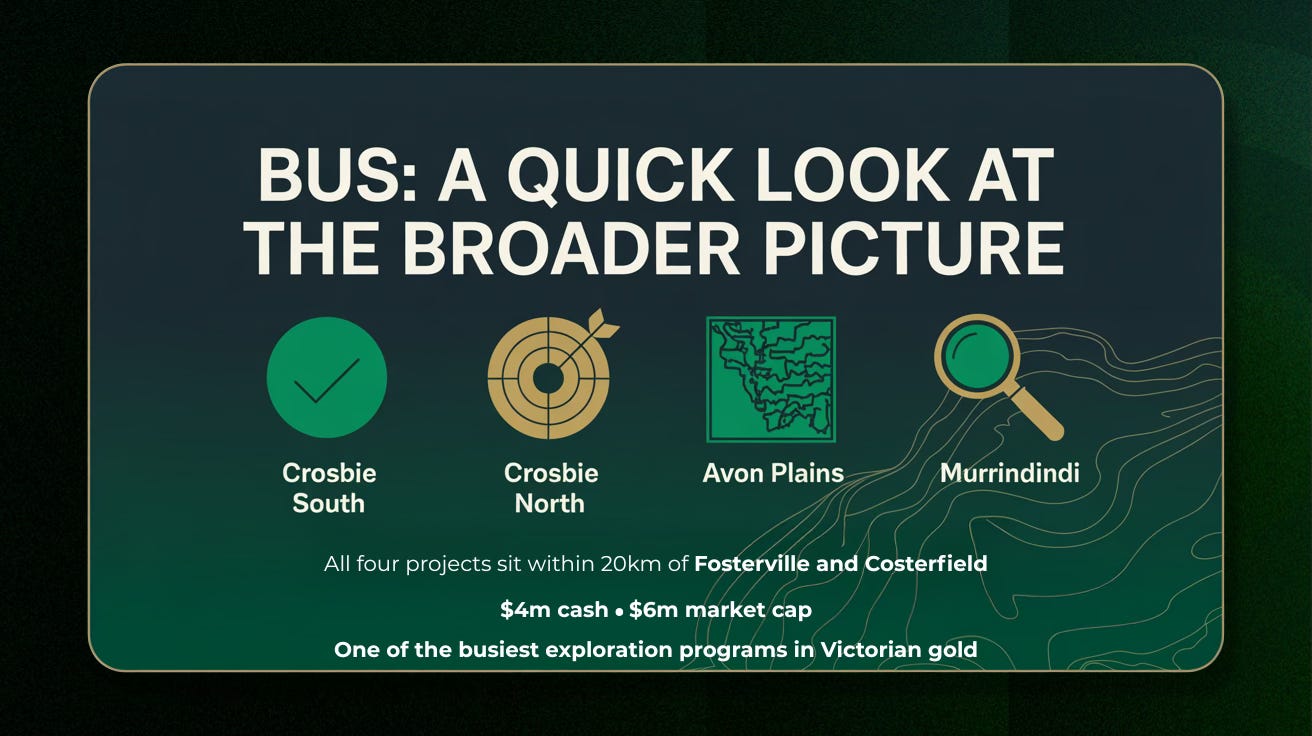 Drilling starts this quarter at Crosbie North, and the pieces are falling into place. BUS has the geology, the geophysics, the cash ($4 million), and now the targets to test whether this Fosterville comparison holds up.