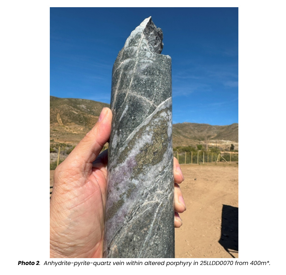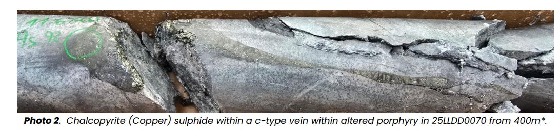 The upper part of the hole has also shown visible chalcopyrite veins (that’s the same copper-bearing mineral found in some of the world’s biggest copper deposits), plus anhydrite and pyrite. These minerals typically turn up when a strong copper system is pushing fluids through the rock.