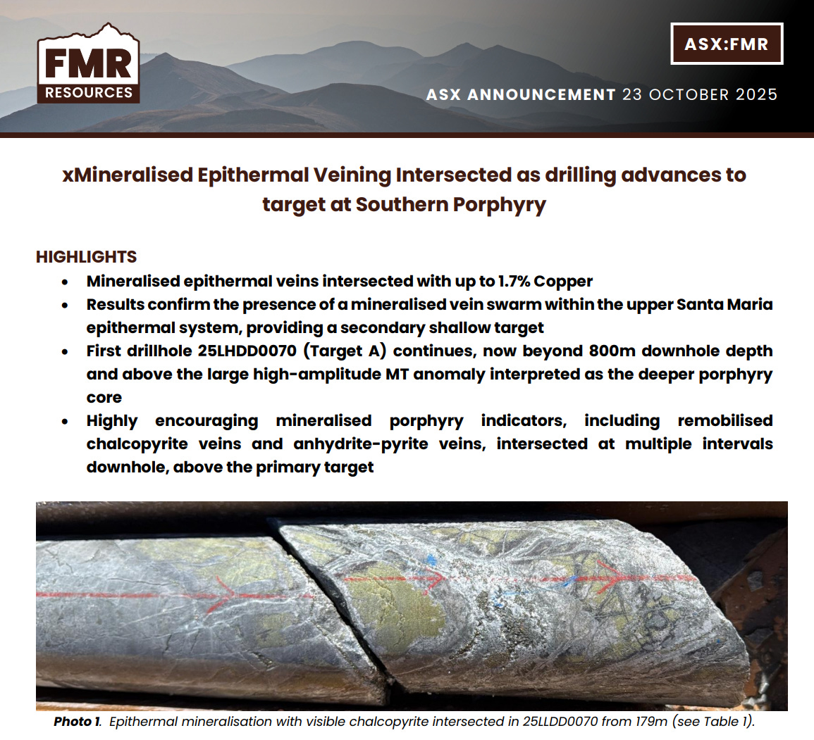 We first backed FMR at 16c earlier this year, seeing real potential in its Chilean ground and tight structure. With drilling now delivering copper where the models predicted (and global copper supply still tightening) that early call is starting to play out.