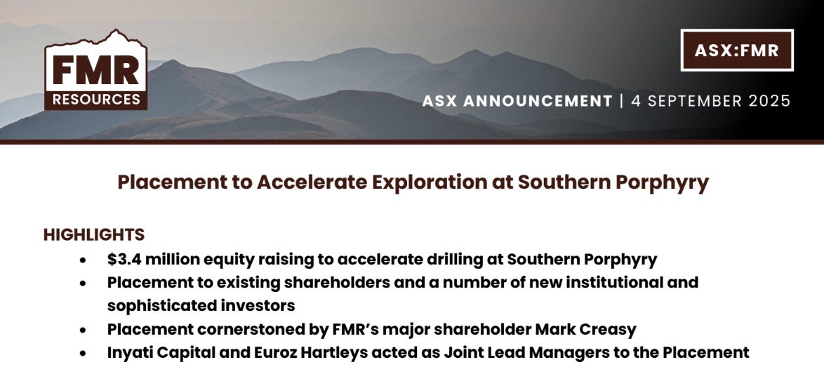 For FMR, the $3.4M placement means it can drill Southern Porphyry without interruption. With more than $7 million in the bank, the company is funded through this campaign and whatever comes next.