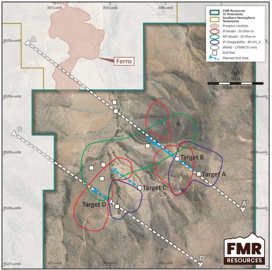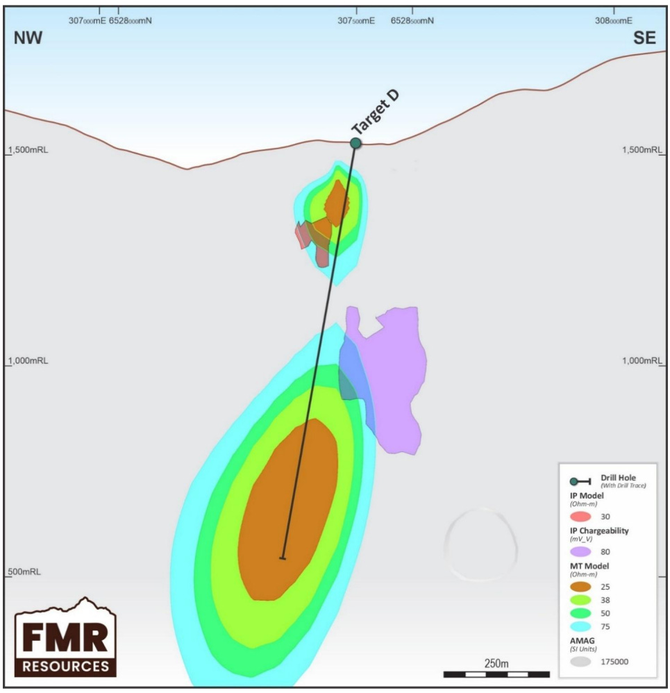 It'll first pass through near-surface features that could signal copper-rich fluids, then punch deeper into a large anomaly that FMR believes could be the heart of the porphyry target.