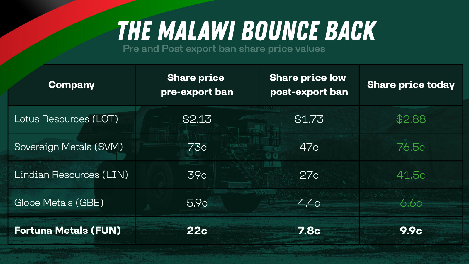 Remember when the company we invested in Fortuna Metals (ASX: FUN) got smashed in October on fears about Malawi’s raw mineral export ban? The stock dropped from 22c to 11c in a single session.