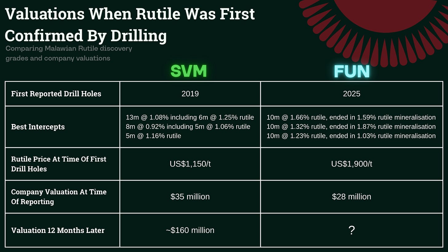FUN has delivered better early drill results, demonstrated across a broad area, in a stronger rutile price environment. At a $28 million valuation, this feels like the beginning of a reassessment that could go much higher.