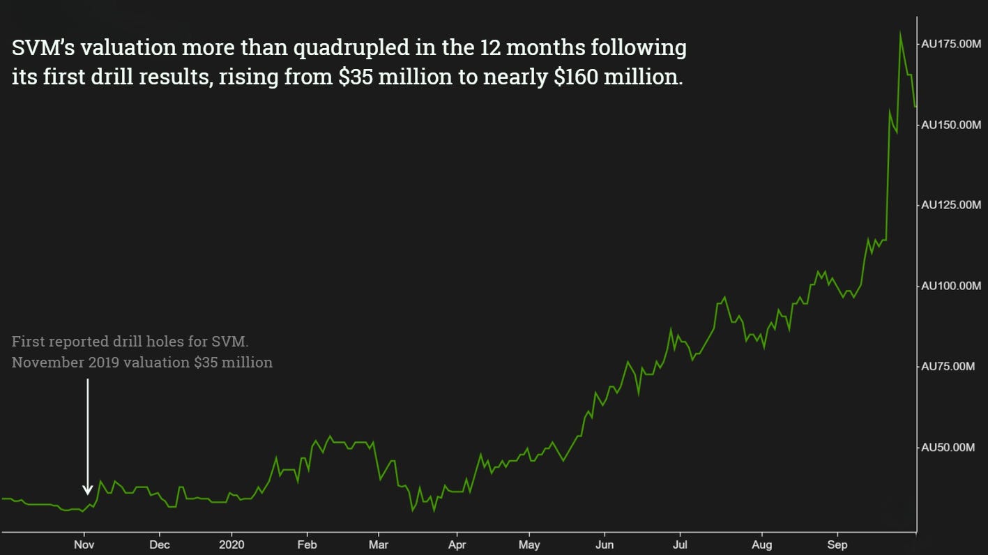 What followed for SVM was a strong re-pricing. Twelve months after those first drill results, SVM was valued at roughly $160 million, a fourfold increase from its early discovery valuation. Continued drilling and resource growth carried it much further from there.