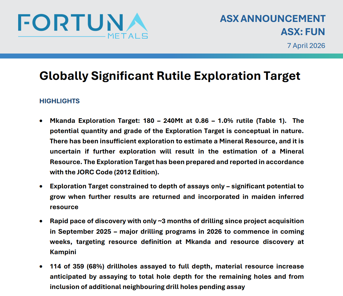 A maiden exploration target of 180 to 240 million tonnes grading 0.86% to 1.0% rutile, outlined in roughly three months of drilling since FUN acquired the Mkanda project.