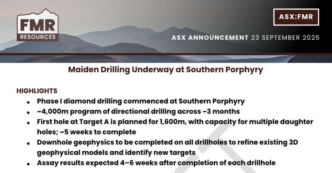 A strong hit at Target A validates everything - the geophysical models, the broader Southern Porphyry system, the entire six-kilometre mineralised corridor. That's when things get properly interesting.