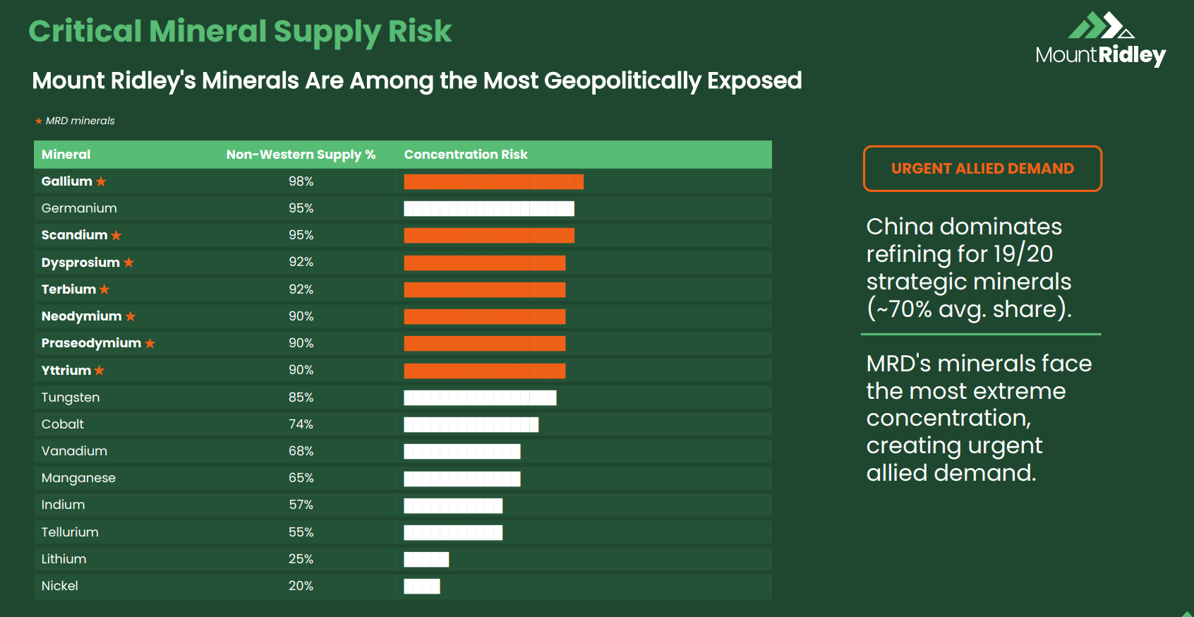 China dominates production and has already imposed export controls. MRD's gallium resource runs to 838.7 million tonnes grading 29.3 ppm, which on paper represents roughly 34 years of current global production.