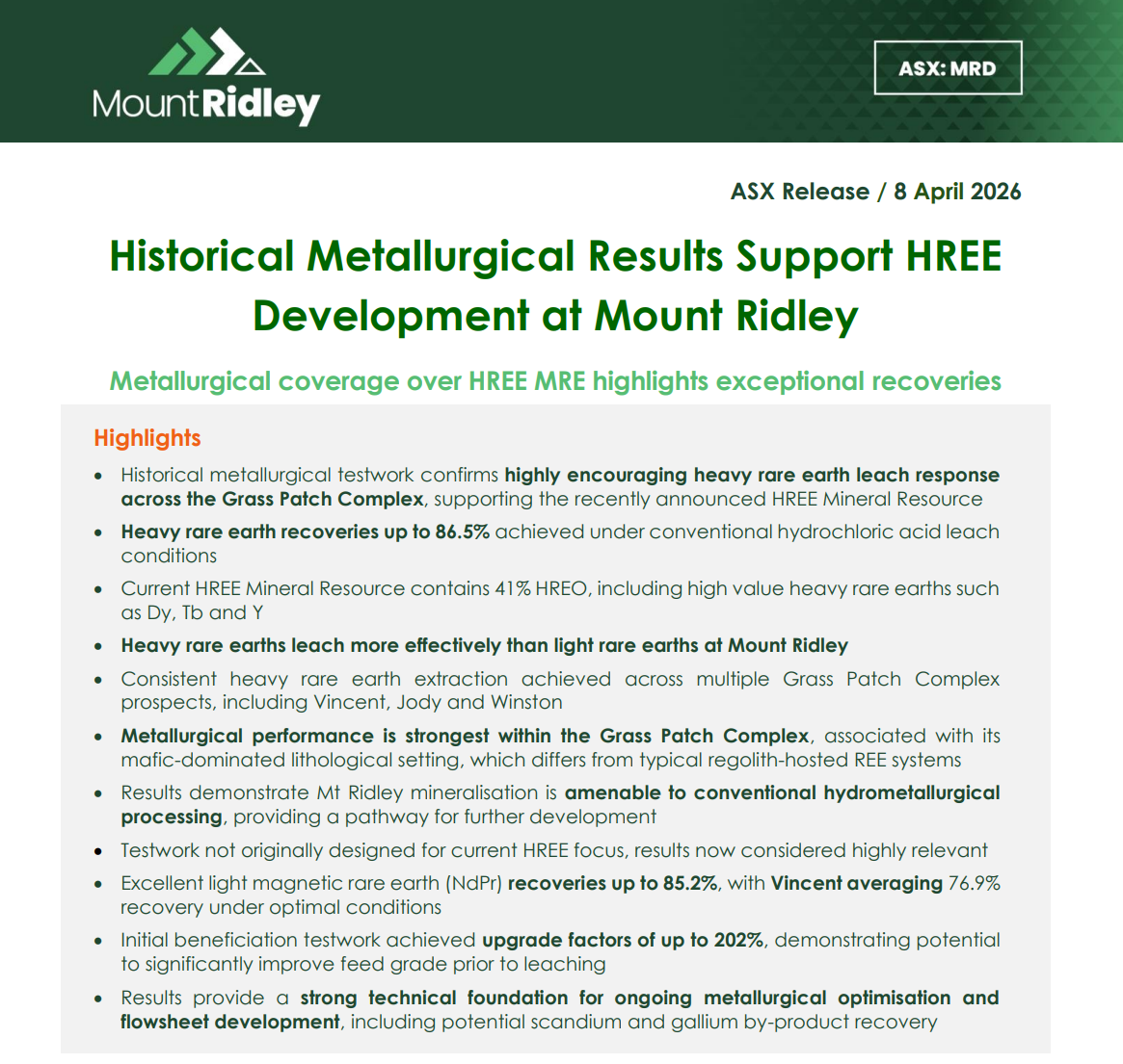 Mount Ridley Mines (ASX: MRD) has released encouraging met testwork results from its Grass Patch heavy rare earth project in Western Australia.