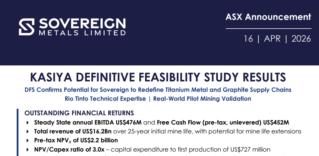 Sovereign Metals (ASX: SVM) dropped its Definitive Feasibility Study (DFS) for Kasiya this week. The numbers make it pretty clear how valuable the rutile and graphite corridor in Malawi really is.