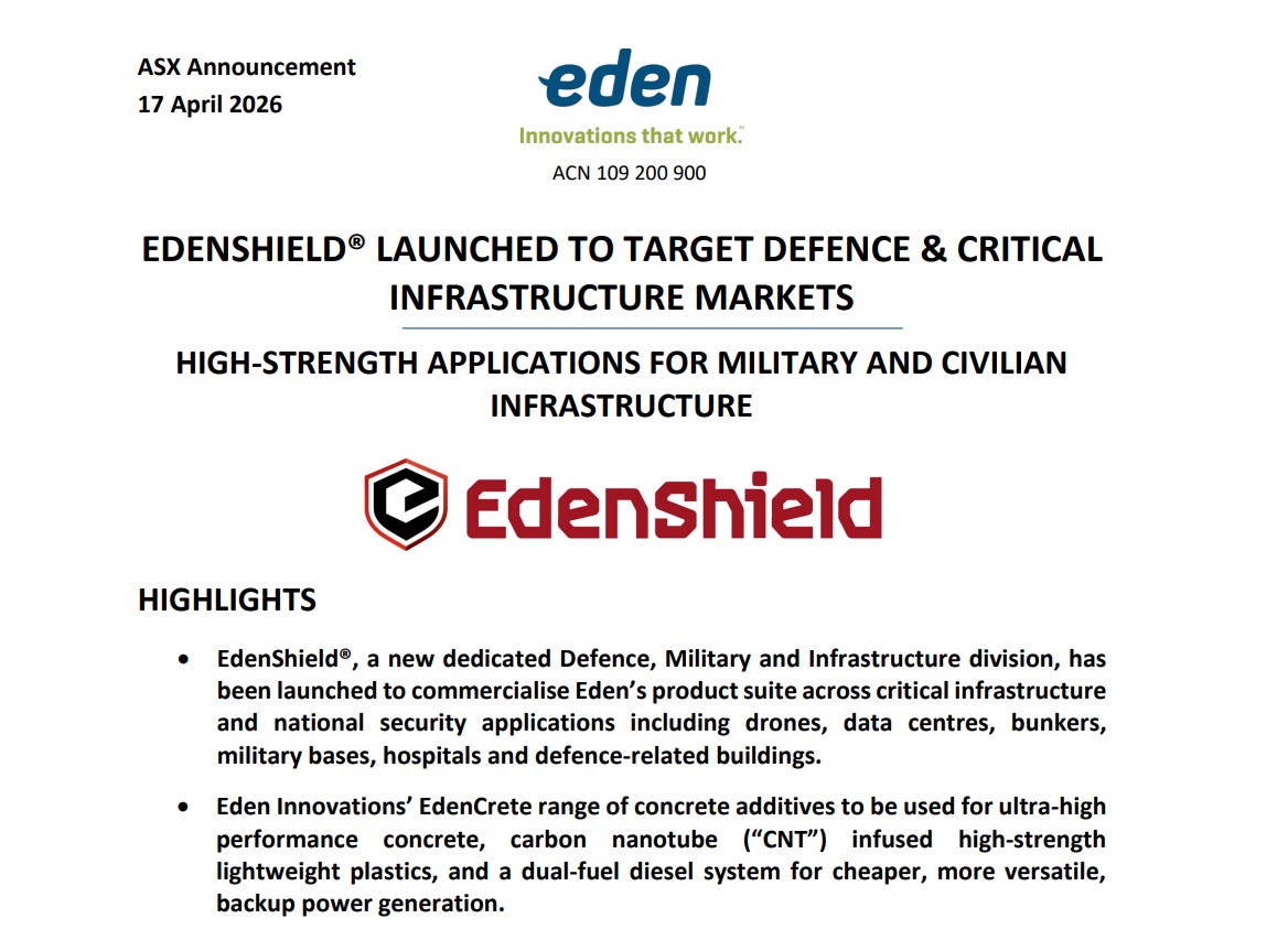 The latest announcement gives you the why. Eden launched its new EdenShield division targeting defence and national security applications, with products including hardened concrete and electromagnetic shielding materials.