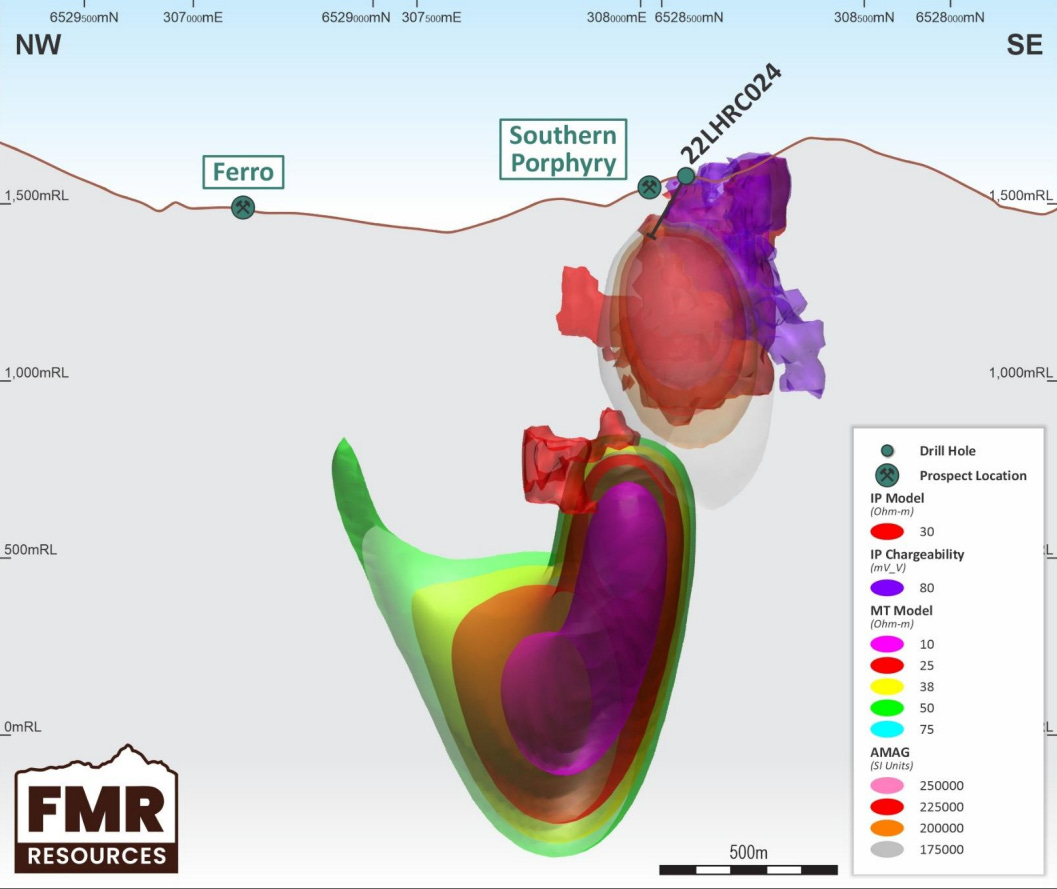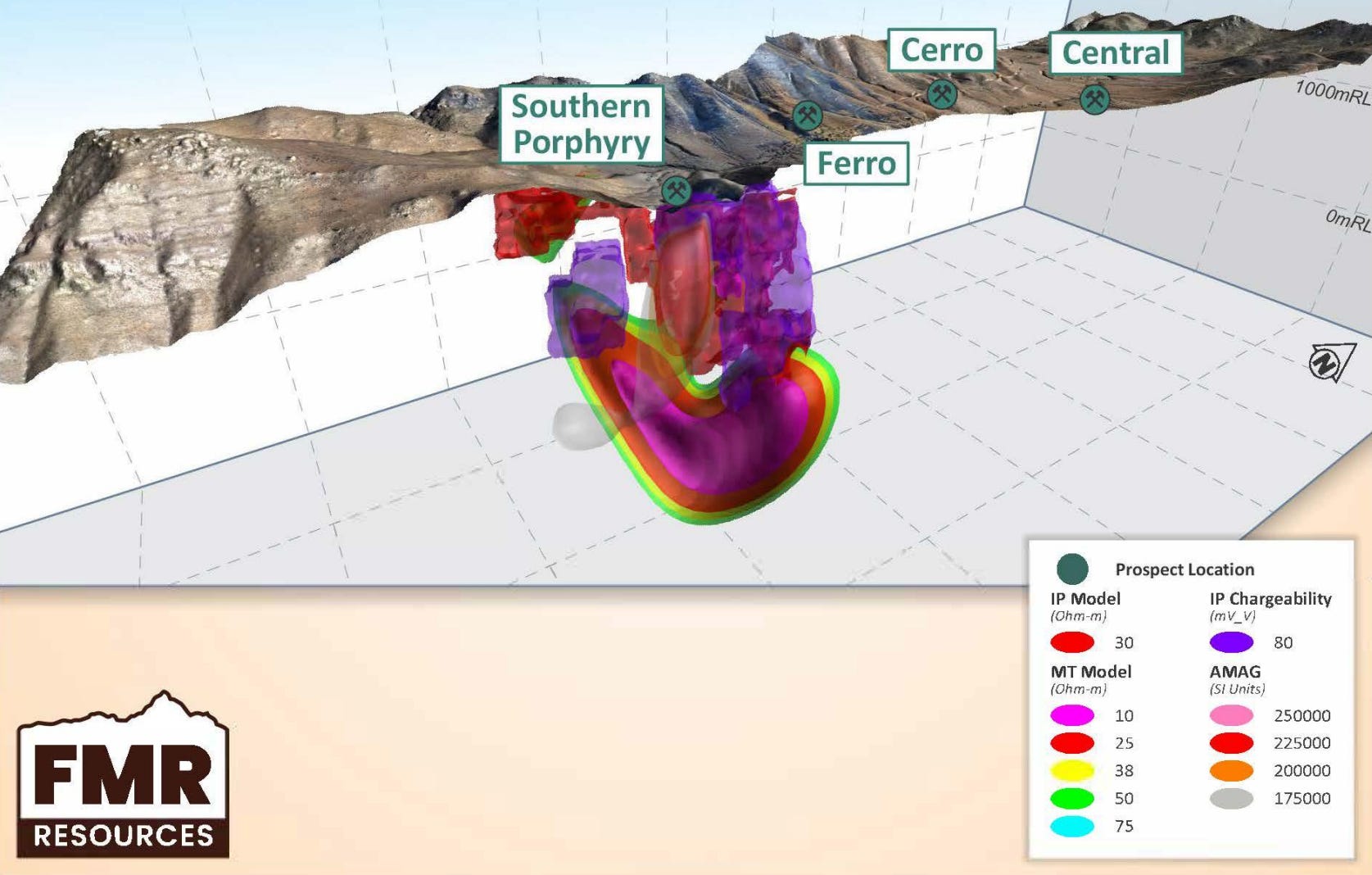 One look at the 3D model of its Southern Porphyry copper target below and you can see why FMR’s excited. Magnetic, resistivity and chargeability datasets don’t often sing in harmony. Here they’re all lighting up the same zone.