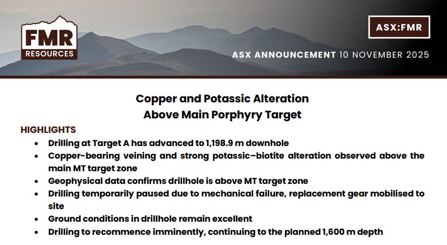 FMR was the first company we backed in 2025, and today it confirmed copper veins and rock types that typically form near large copper systems. In short, management is seeing the signs that often lead to major discoveries.