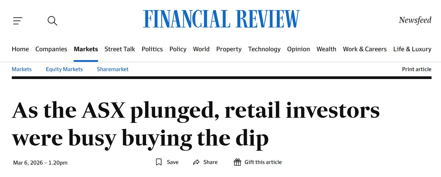 The ASX was hitting record highs week on week before bombs started falling on Tehran. A quick return to those levels looks unlikely while the Strait of Hormuz is shut and Trump is demanding unconditional surrender from Iran. Reports are shifting by the hour, and until there’s more clarity, expect the volatility to stick around.