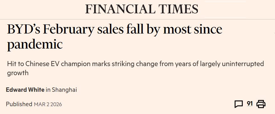 BYD, the world’s largest EV maker, posted combined January and February sales down roughly 36% year-on-year, which is a big miss for what has been the sector’s strongest growth story.