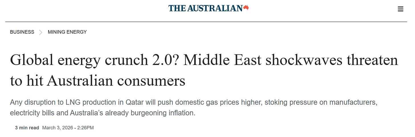 For Australian LNG producers, higher prices mean bigger margins on the roughly 70% of our gas that gets exported. For everyone else, it means higher bills - our domestic gas market has been tied to international pricing since the export boom of the 2010s, so when global prices spike, we cop it too.