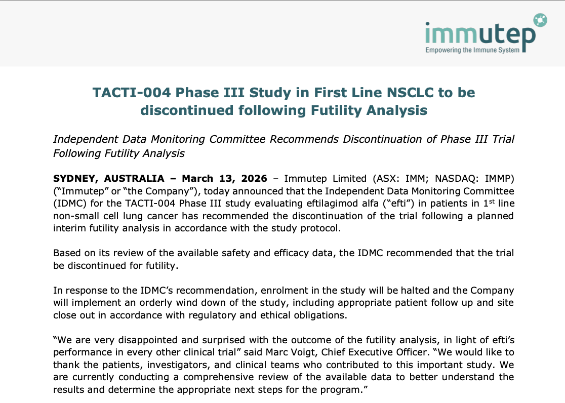 The cause was a Phase 3 trial failure. Immutep’s lead drug Efti, a lung cancer therapy designed to work alongside Merck’s Keytruda, got scrapped on the recommendation of an independent review committee. Years of development, trials across 27 countries, and the whole thing came down to one sentence.