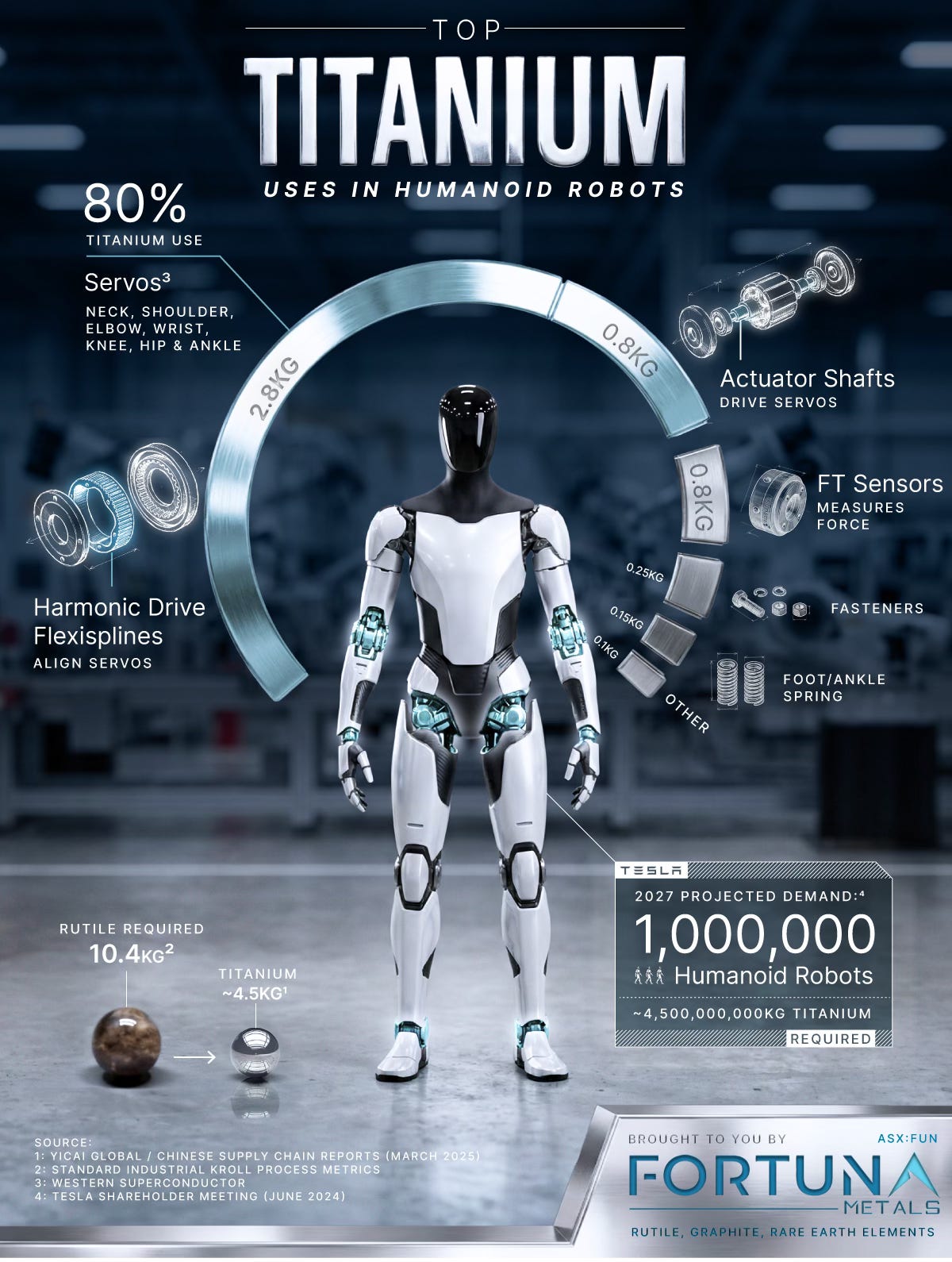 Each robot requires an estimated 10.4 kilograms of rutile. The US imports 100% of its titanium and legacy producers are in decline.