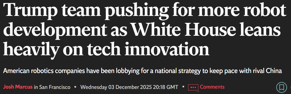 The Trump administration is reportedly preparing an executive order to fast-track a national robotics strategy. The Independent and Politico both ran stories this week about plans to build robotic manufacturing capacity onshore and lock in long-term supply of the metals that feed it.