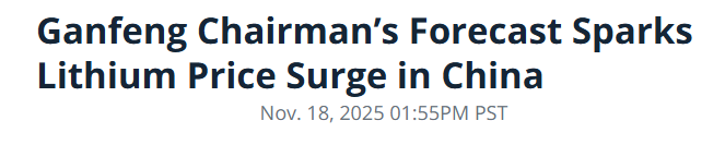 This week, the focus turned to fresh commentary out of China. Ganfeng, one of the largest lithium producers globally and a major supplier to battery makers, set the tone when chairman Li Liangbin suggested lithium carbonate prices could rocket in 2026.