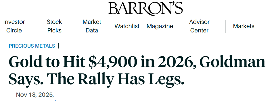 Goldman Sachs went even bigger with US$4,900/oz by the end of 2026, banking on reserve banks staying hungry and investors piling in once the US Federal Reserve likely cuts rates.