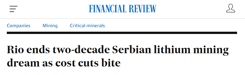 Rio Tinto quietly pulled the pin on its US$3.7 billion Jadar lithium project in Serbia this week, officially blaming cost cuts, but most know the real story.