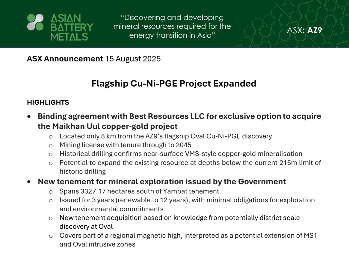AZ9 expanded its Mongolian footprint with a copper-gold acquisition.
