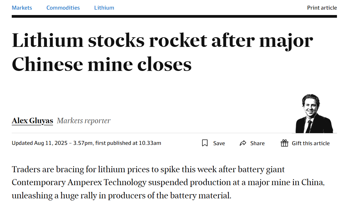 China’s closure of a lepidolite mine this week jolted the lithium market, sending Australian lithium stocks sharply higher on Monday.