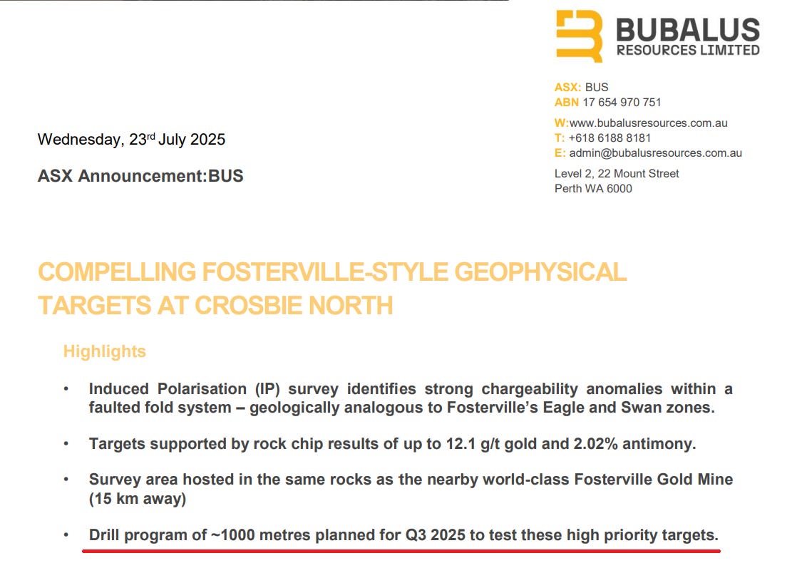 BUS is due to drill a Fosterville-style target in Victoria, followed by drilling a historic high-grade gold mine to finish 2025.