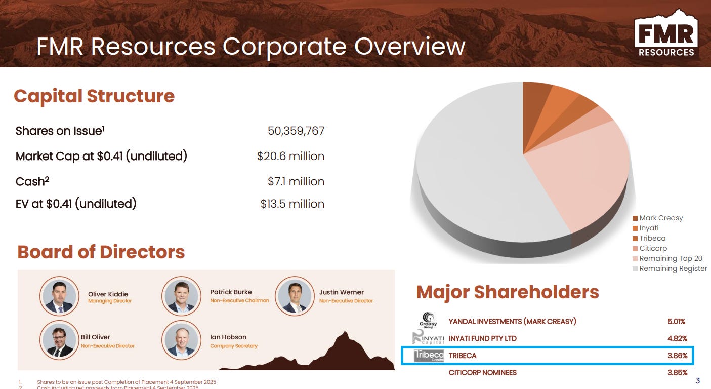 FMR Resources dropped an investor presentation early in the week, and one detail stood out from the recent raise. Tribeca Capital now holds just under 4% after backing the placement.