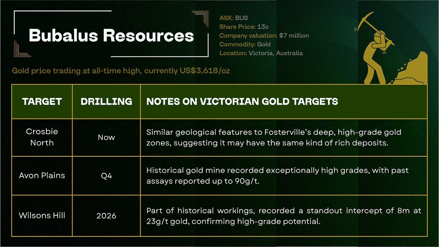 Bubalus Resources could be the sleeper. They're drilling Victorian gold targets just as the metal hits fresh records. With any decent results, this $7 million company likely won't stay that way for long.