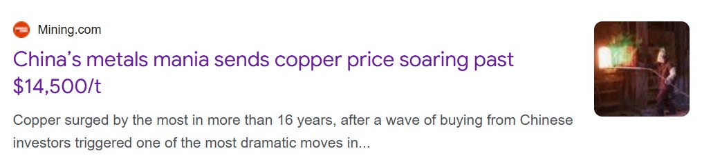 Copper followed the same pattern as gold and silver. Prices pushed through US$14,000 and briefly traded above US$14,500 on Thursday.