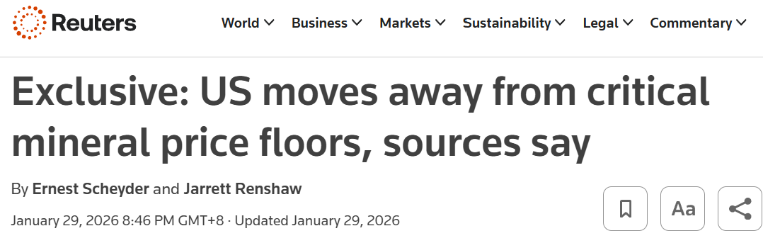 Australia's been floating its own A$1.2 billion critical minerals strategic reserve. Resources minister Madeleine King said the US backing away won't change Canberra's plans, and they're still looking at price floors to support local projects.
