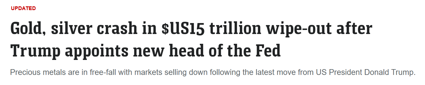 After the nomination profit-taking kicked in, the US dollar firmed, and gold dropped more than 8% in a single session. By the close it was sitting near US$4,890, not far off the lows.