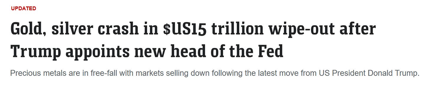 Friday delivered exactly that. Trump nominated Kevin Warsh for Fed chair, who has a reputation for favouring tighter monetary policy over easy money. During a previous stint at the Fed, he was vocal about the risks of quantitative easing and warned about the Fed's balance sheet ballooning. The market read the nomination as a signal that rates might stay higher for longer rather than getting slashed to juice the economy. Some of the gold rally had also been a bet on dollar debasement.