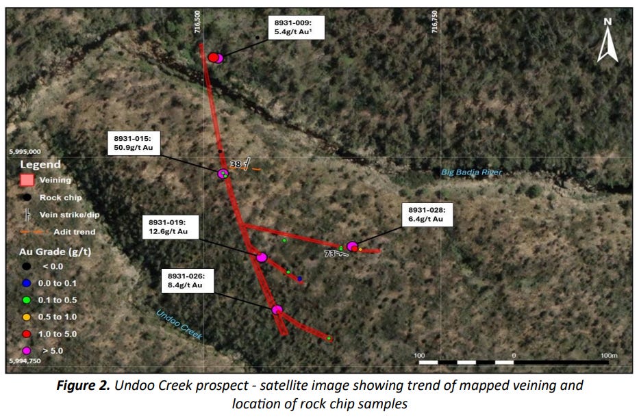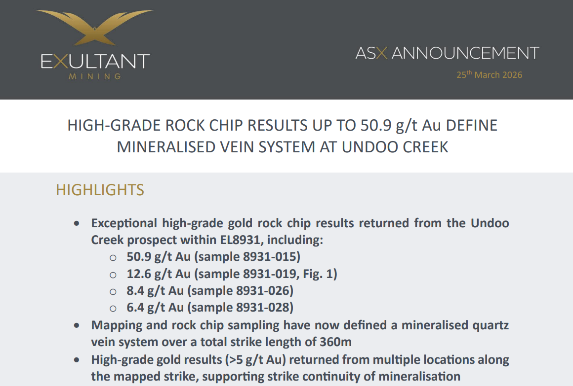 Exultant Mining (ASX: 10X) dropped rock chips this week running at 50.9 g/t, 12.6 g/t, 8.4 g/t and 6.4 g/t gold along a quartz vein system now mapped across 360 metres of strike.
