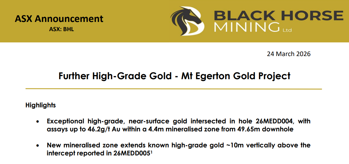 Our portfolio company Black Horse Mining (ASX: BHL) finished the week up 27% after further high-grade results from its Mt Egerton gold project in Victoria.