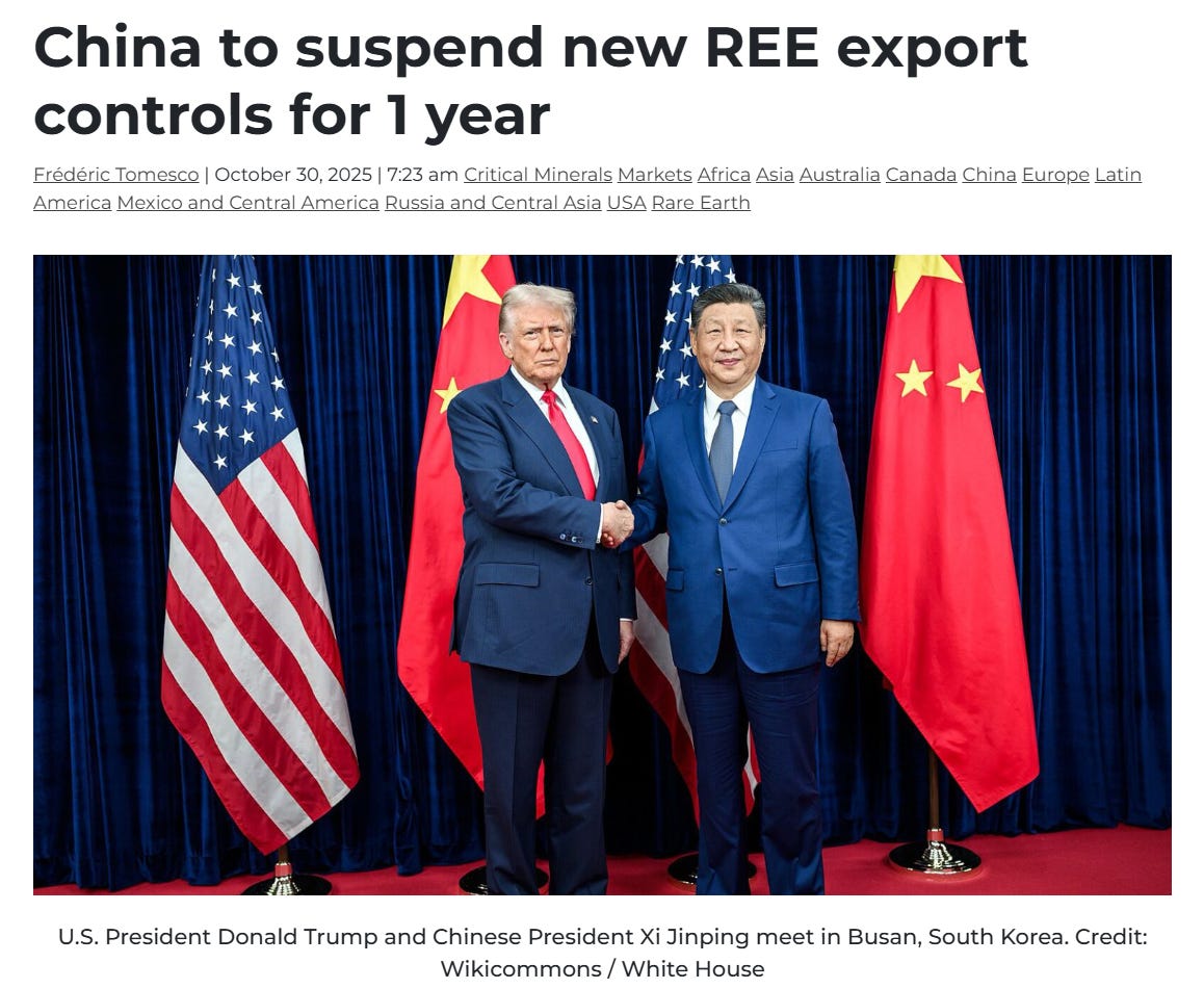 Trump had a “12 out of 10” meeting with Xi in Busan this week and struck a deal that actually matters for critical minerals – China agreed to suspend its export controls on rare earths for a year.
