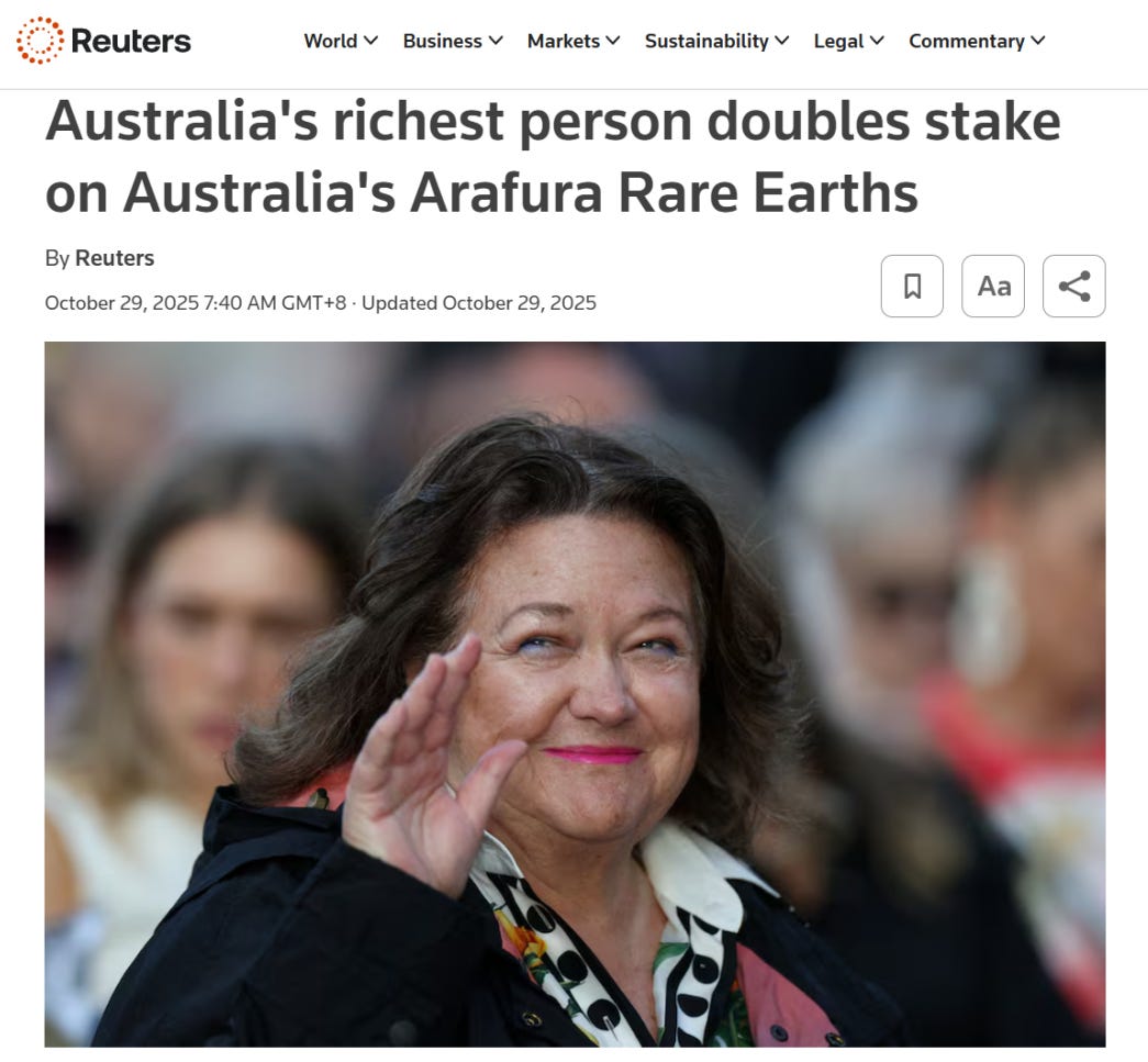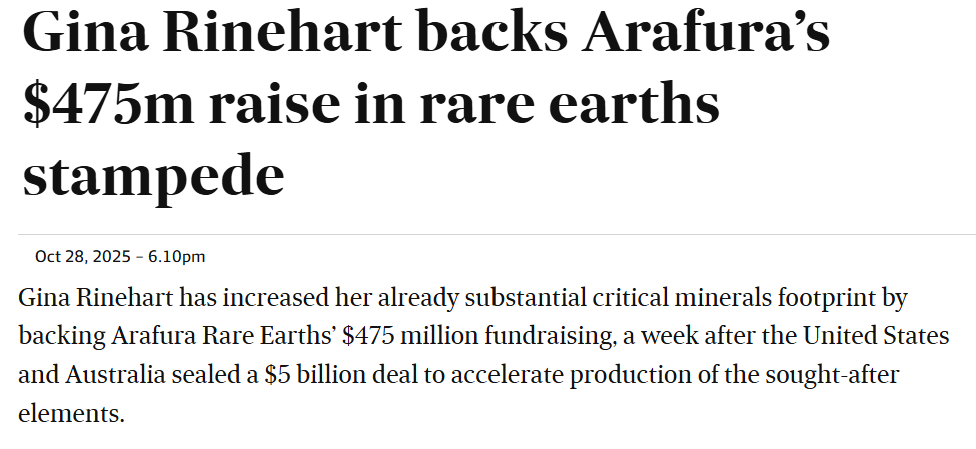 Speaking of critical minerals and rare earths, Arafura Rare Earths (ASX: ARU) secured $475 million this week to finally build its Nolans Project, with Gina Rinehart’s Hancock Prospecting taking a big chunk of the raise.
