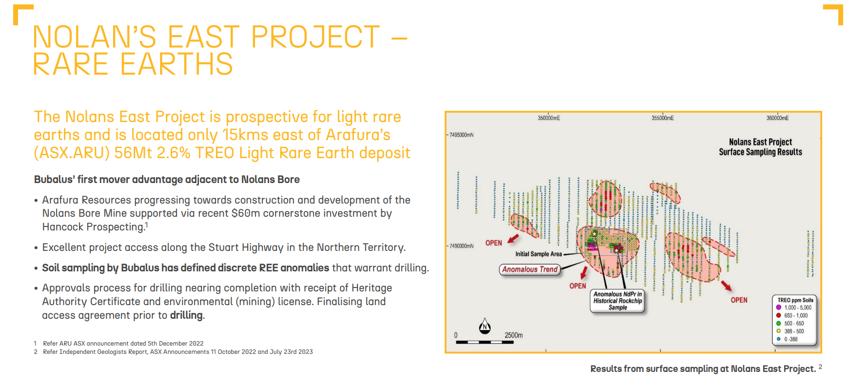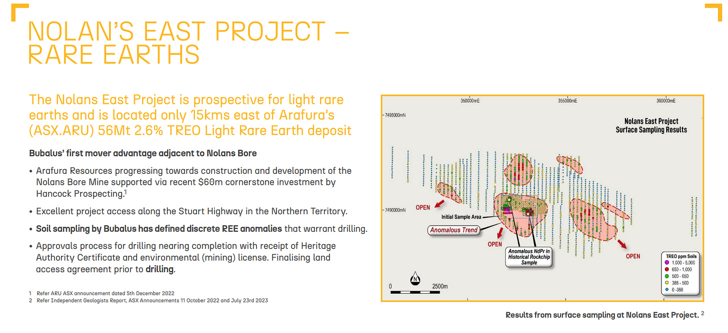 In the Northern Territory, our portfolio company Bubalus Resources (ASX: BUS) holds ground directly beside ARU’s $1 billion-plus Nolans Project, conveniently named Nolans East.