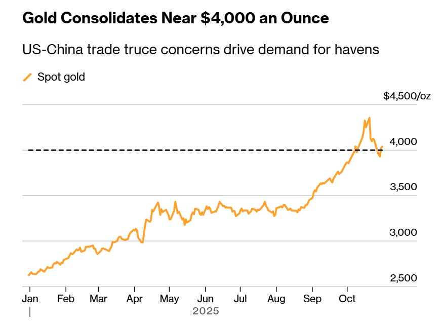 Gold gave investors a proper scare early this week, dropping below US$4,000/oz on Monday as the US dollar flexed and yields spiked. By Friday, it was back above $4,000, and anyone without ‘diamond hands’ who sold the dip was probably kicking themselves.